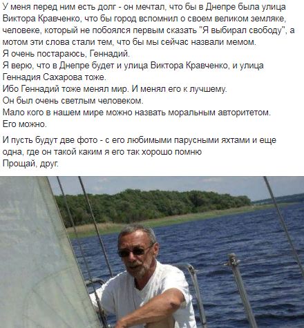 Об этом сообщил 29 ноября в Facebook Олег Ростовцев. "Очень скорбная весть. Ушел Геннадий Сахаров, замечательный человек, редкой порядочности и принципиальности".