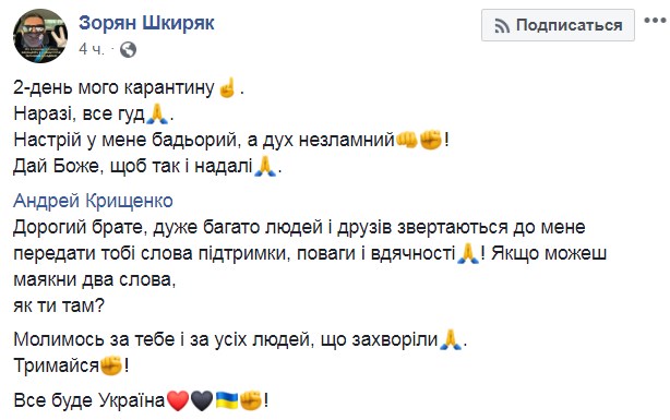 Заразившийся коронавирусом начальник полиции Киева Андрей Крищенко и находящийся на карантине Зорян Шкиряк поддержали друг друга в соцсетях