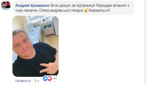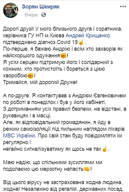 "... Я контактировал с Андреем Евгеньевичем в понедельник, был в его кабинете. С соблюдением всех правил безопасности расстояния, в перчатках и в маске. Но, как ответственный гражданин, я иду в режим самоизоляции под наблюдением врачей МВД Украины", - написал он.