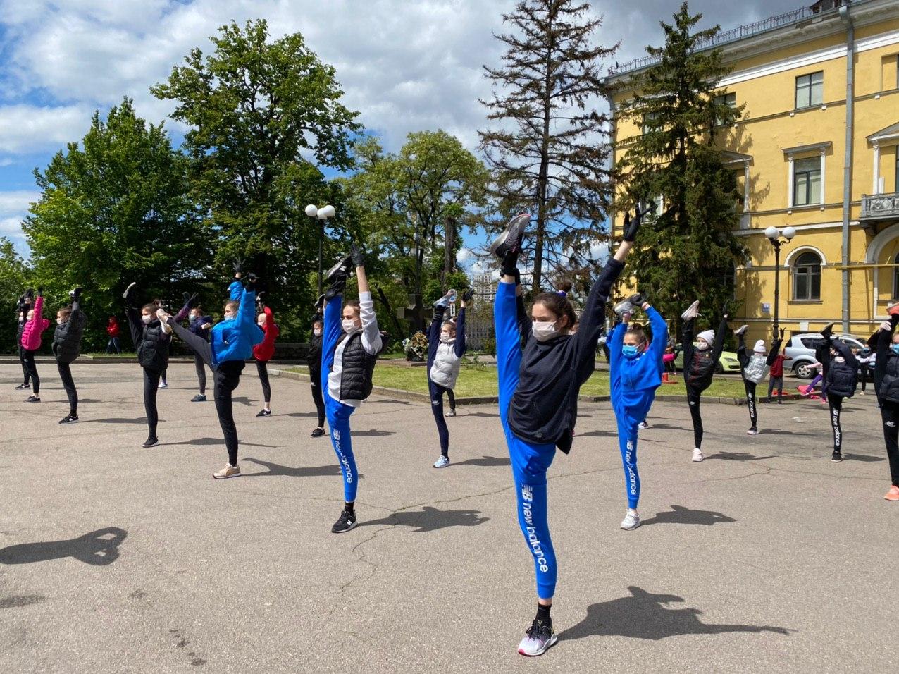 Под открытым небом возле Жовтнеого дворца в Киеве 1 июня состоялась тренировка украинских гимнасток из "Школы Дерюгиных". Из-за аварийного состояния помещения спортсменок выселяют из Жовтневого дворца.