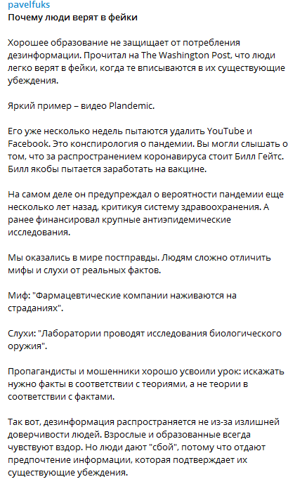 Украинский меценат и бизнесмен Павел Фукс поделился с читателями своего Телеграм-канала статьей The Washington Post о том, что люди легко верят в фейки, когда те вписываются в их существующие убеждения. Пример такой ситуации - видео Plandemic, конспирология о пандемии. Уже несколько недель его пытаются удалить YouTube и Facebook. Ходили слухи, что за распространением коронавируса стоит Билл Гейтс и пытается заработать на вакцине.