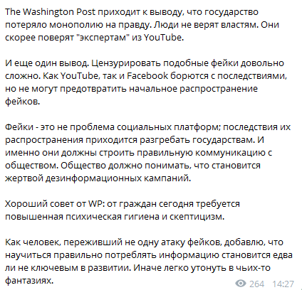Фукс пишет, что человечество оказалось в мире постправды. И людям сложно отличить мифы и слухи от реальных фактов. The Washington Post также делает вывод, что государство потеряло монополию на правду, а люди не верят властям. Они скорее поверят "экспертам" из YouTube.