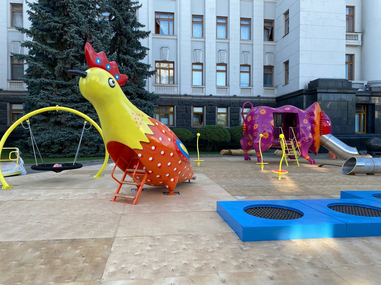 В понедельник, 9 августа, корреспондент ASPI news проверил ход монтажных работ праздничной площадки для детей на Банковой. Стоит отметить, что среди новых "архитектурных сооружений" осталась также и установка в виде зеркальной надписи YOUkraine. ASPI news писало, что инсталляция под ОП появилась 11 апреля. Она посвящена 30-летию Независимости Украины.