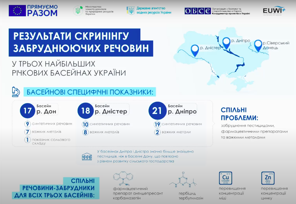 "Что было сделано во время скрининга: были отобраны образцы воды, образцы биоты для того, чтобы определить состав химических веществ-загрязнителей, которые сегодня присутствуют в бассейне рек Украины. Речь идет о реках Днестр, Дон и Днепр. Кроме скрининга обычных загрязнителей, которые мы понимали, что найдем, был проведен целевой скрининг по 2 тысячам загрязняющих веществ и соединений и нецелевой скрининг, который показал почти 65 000 таких вредных соединений. Мы обнаружили, что значительное загрязнение вод идет от фармацевтических средств. К сожалению, сейчас во время пандемии коронавируса много фармацевтики попадает в реки. Также были найдены соединения тяжелых металлов, таких как цинк, медь и т.д.", - сообщил министр защиты окружающей среды и природных ресурсов Украины Роман Абрамовский.